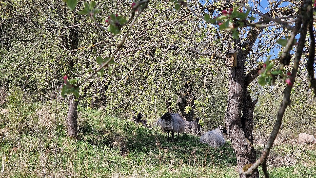 Die Wiese ist ein Rückzugsort, nicht nur für den Obstbauern, sondern auch für die Tierwelt. Vieles, was in der aufgeräumten Agrarlandschaft keinen Platz mehr findet, kommt hier unter. Das ist der Unterschied zur Plantage. Es geht am Ende auch um Ertrag, aber der ist nicht das alleinige Ziel. Wenn die Schafe die Wiese abgrasen, kommen Blindschleiche und Kröte noch weg, beim Rasenmäher schaffen sie das nicht. Die Hinterlassenschaften der Schafe locken Insekten an, die links und rechts auf dem Acker weg gespritzt werden, die Insekten bestäuben die Bäume, die Bäume bringen die Frucht, die Frucht ernährt Mensch und Tier.