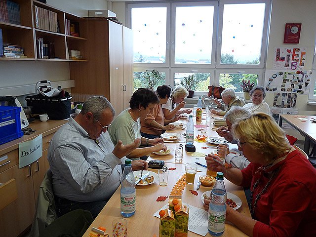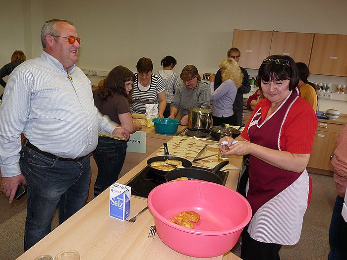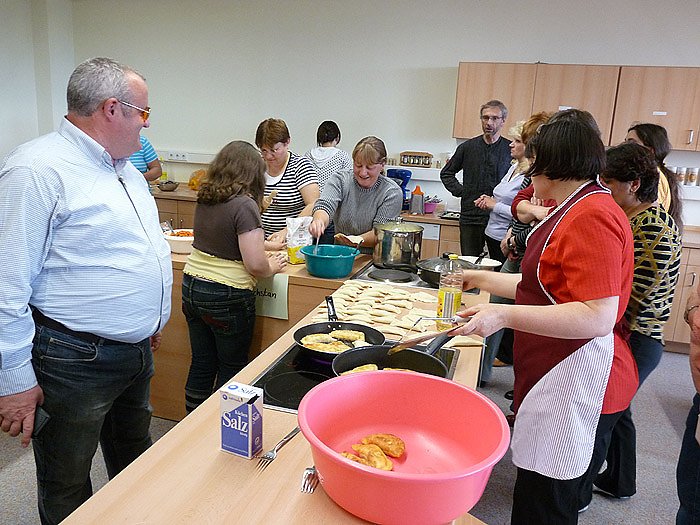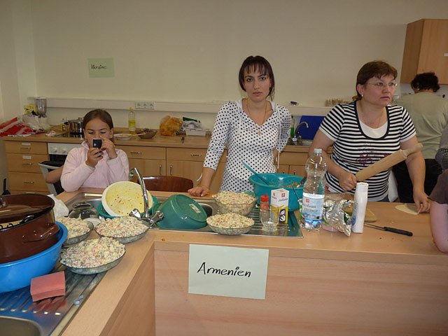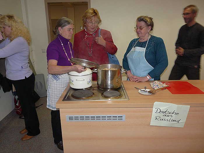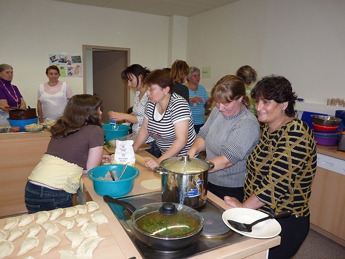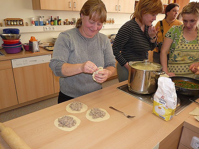 Unterhaltung und Gekochtes aus Russland, Ukraine, Kasachstan, Aserbaidschan und Armenien boten Mitwirkende der Begegnungsstätte für Migranten KONTAKT. Die Gäste konnten nicht nur den Köchinnen auf die Finger schauen, sondern selbst bei der Zubereitung mitmachen. Das Nachkochen zu Hause war ausdrücklich erwünscht. Aber auch ein aus Deutschland stammendes Gericht wurde gekocht.