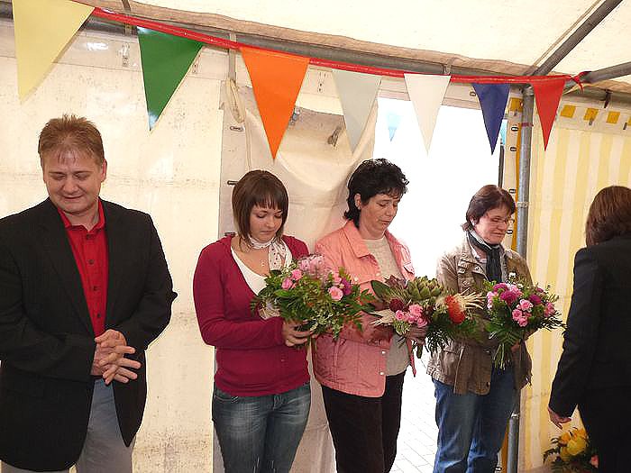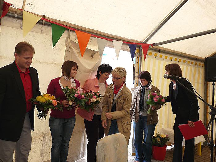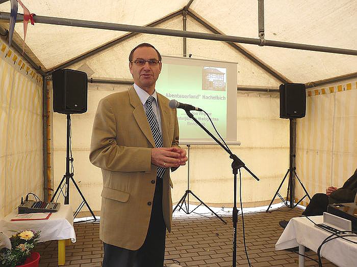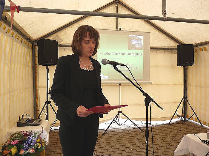 Viele Gäste konnte die Leiterin der Einrichtung, Andrea Hotze (Bild unten), heute in Hachelbich begrüßen. Ein Zelt musste extra aufgebaut werden, weil in der Einrichtung selbst nicht so ein Raum ist, der genutzt werden könnte, ohne die Kinder ausquartieren zu müssen. Natürlich waren der Vorsitzende des Trägervereins der Einrichtung (Starthilfe e.V.) Georg Schäfer und der Geschäftsführer Jürgen Rauschenbach mit dabei. Schäfer gleich in Doppelfunktion, denn er vertrat den Landrat, der heute nicht teilnehmen konnte.