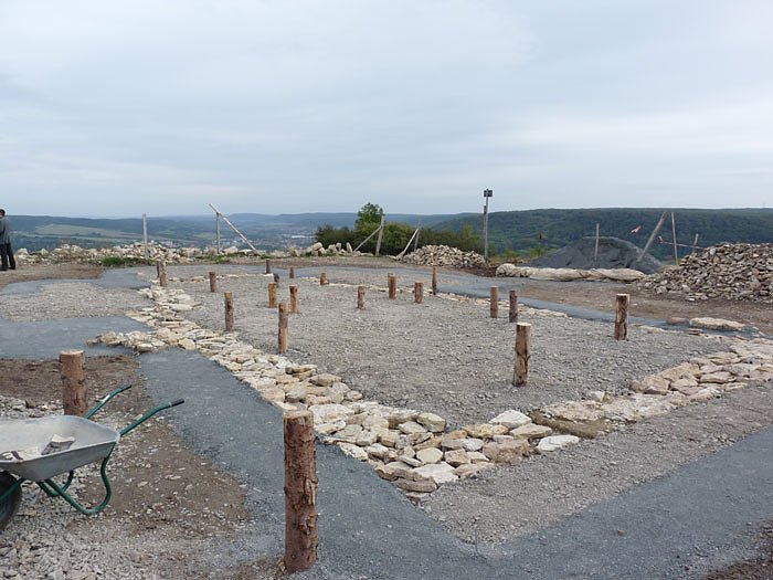 Auf die Fundamentumrisse werden dann noch sogenannte Gabionen aufgesetzt (ca. 50 cm hoch). Gabionen sind solche Drahtkäfige, in den Steine drin sind. Solche Konstruktionen sieht man häufig zur Sicherung von Wänden und Hängen gegenüber Wegen. Voraussichtlich werden die Gabionen noch dieses Jahr aufgesetzt. Dann wird auch der Wall mit dem bisherigen Drahtzaun verschwinden.