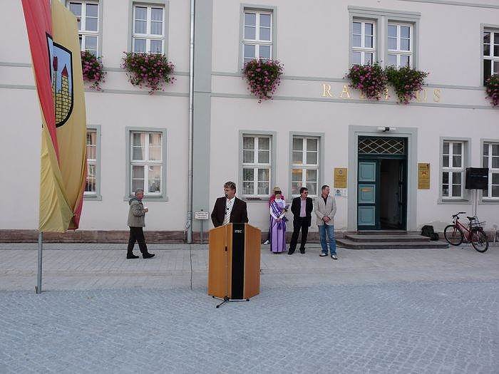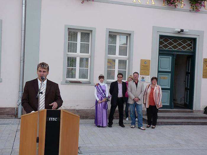 Vor der feierlichen Übergabe blickte Bürgermeister Matthias Strejc (SPD) auf die Baumaßnahmen der letzten Jahre zurück. Seit der Wende wurden gut 50 Millionen Euro für Infrastrukturmaßnahmen in der Stadt Bad Frankenhausen ausgegeben. Im Beisein vieler Stadträte und des Mitglieds des Landtages Gudrun Holbe (CDU) bedankte sich Strejc für die Geduld der Händler in der Innenstadt, die es durch die Baumaßnahmen wirklich nicht leicht hatten.