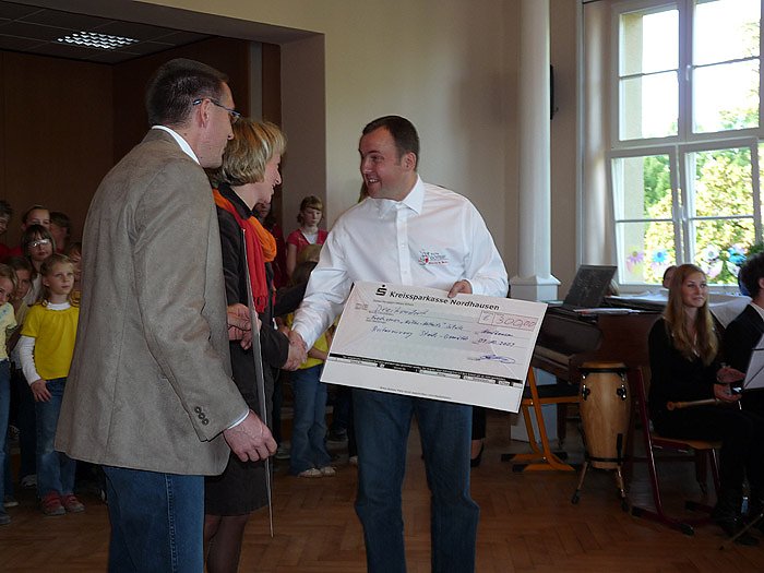 Im Auftrag vom Förderverein der Käthe-Kollwitz-Grundschule Sondershausen übergab heute Werner Triebel einen Scheck in Höhe von 500 Euro, damit das fehlende Geld für das von Professor Stade in Öl auf Leinwand gemalte, großformatige Bild (230 x 510 cm) weiter zusammenkommt. Das Gemälde wurde aus Anlass des 50jährigen Bestehens des am 01.05.1844 gegründeten Landesseminars zu Sondershausen in Auftrag gegeben, und befindet sich noch in der Renovierung. Leider so Mario Wilke vom Förderverein ist es nicht bis zum Jubiläumstermin fertig geworden. Es soll aber im März 20010 in einer Ausstellung im Schlossmuseum gezeigt werden.