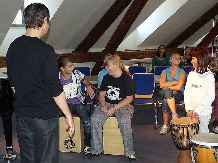 Und dass es den "fiktiven" Schülern Spaß gemacht hat, kann man wohl an den Fotos unschwer erkennen. Nebenbei haben die Schüler selbst auch noch einiges gelernt, oder kennen Sie vielleicht das Musikinstrument, auf den die beiden Mädchen ihren Spaß haben? Es ist ein Cajon ( geschrochen wie Cachon), ein Schlaginstrument das aus den alten Bananenkisten entwickelt wurde. Aber auch zur Notenlehre konnten die Schülerinnen und Schüler einiges erfahren.
