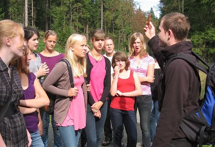 Das ist ein Fichtenzapfen - Frank Königstein erklärt einer Schulklasse, warum es im Harz keine Tannenzapfen gibt