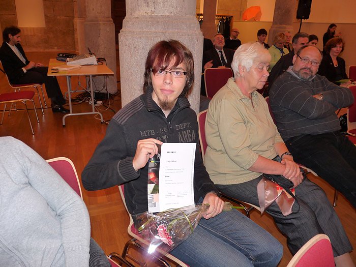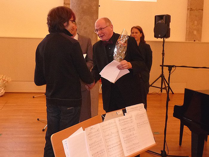 Mit einer weiteren Komposition, "Das Beste, was es gibt" für Klavier und Vocals vorgetragen von Torsten Bischof steuerte das Preisträgerkonzert auf den Höhepunkt zu, der Preisverleihung, die von Wolfgang Wollschläger, Mitglied der Jury des 2. Landeswettbewerbes Jugend komponiert 2009 vorgenommen wurde.
