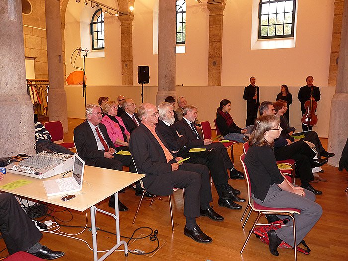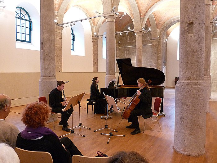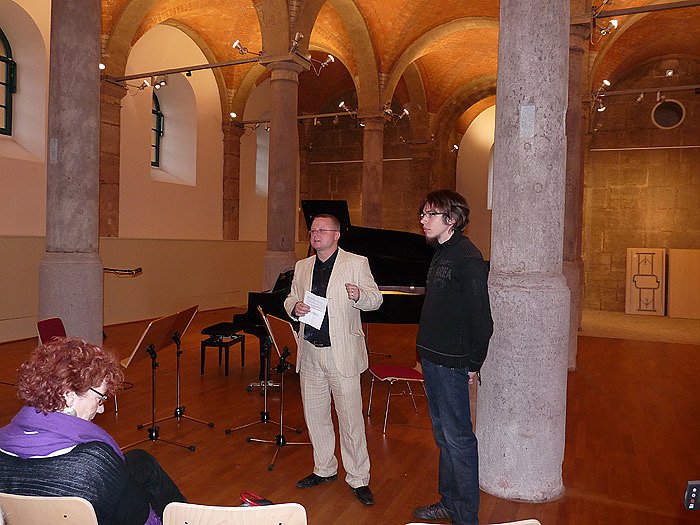 Das Programm startete mit der Triosonate für Klarinette, Cello und Klavier, 1 .Satz von Patrick Schäfer aus Augsburg (*1993). Danach begrüßte Johannes K. Hildebrandt, Mitglied des Landesausschusses Jugend komponiert im Landesmusikrat Thüringen den kleinen Kreis der Gäste, die sich in der Säulenhalle des ehemaligen Marstalls eingefunden hatten. Als Ehrengäste begrüßte er vom Thüringer Kultusministerium Eberhard Langenfeld, den Direktor der Landesmusikakademie Thüringen, Prof. Dr. Eckhart Lange, vom Landratsamt Kyffhäuserkreis den Abteilungsleiter II SG Kulturarbeit, Museen, Theater/Orchester GmbH, Dr. Ekkehard Müller und von der Sparkassen-Kulturstiftung Hessen-Thüringen,Dr. Helge Wittmann.