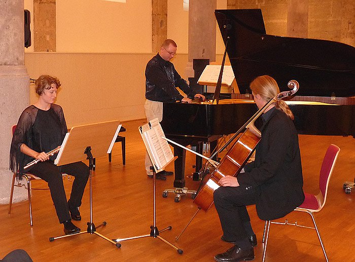 Das Stück A Next Hope wurde heute leider nicht gespielt, da der Komponist, Stephan Ostermann aus Nordhausen (*1990) nicht anwesend sein konnte. Zum Abschluss dieses Konzertes gab es die Komposition Annäherung III für Flöte, Violoncello und Klavier von Juror Johannes K. Hildebrandt. Viel Beifall gab es am Schluss für die Interpreten, welche die Stücke der jungen Komponisten vortrugen.