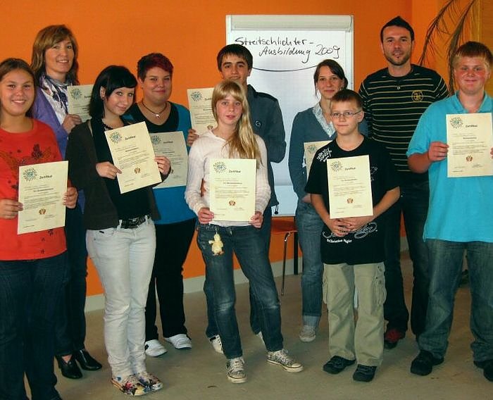 Die Jugend- und Bildungsreferentin der Nordhäuser Stadtverwaltung, Stefanie Knoche, initiierte aus diesem Grund in Kooperation mit dem HORIZONT e.V. eine Streitschlichter-Ausbildung. Vom 5. bis 9. Oktober wurden in der HinterHofWerkStadt des Sozial-Integrativen-Zentrums beim HORIZONT sieben Schüler und eine Lehrerin der Regelschule Ost in Nordhausen zum Streitschlichter bzw. Co-Streitschlichter ausgebildet.