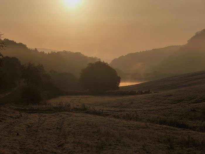 Herr König beobachtete zwischen den beiden Orten diesen Sonnenaufgang, der die gesamte Region der Talsperre Iberg in ein diffuses Licht tauchte. Der tief liegende Nebel tat sein Übriges.