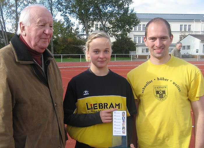 Entscheiden über die Pokalvergabe sollte das Ergebnis des Herbstspringens im Vergleich zur eigenen Bestleistung (2,40m / 3,50m). Dieser Modus spornte beide an. Abwechselnd bewältigten sie die jeweiligen ersten 4 Höhen souverän. Die Entscheidung fiel als Maike im zweiten Versuch 2,30 m bewältigte und Sven die 3,40 m nicht überwinden konnte. Nach diesem spannenden Duell konnte Maike aus den Händen des Vereinspräsidenten Dieter Jürgens den begehrten Wanderpokal in Empfang nehmen und damit die Nachfolge von Georg Leitzke (2003), Steven Richter (2004/07), Claudia Karnstedt (2005) und Momo Sene (2006/08) antreten.