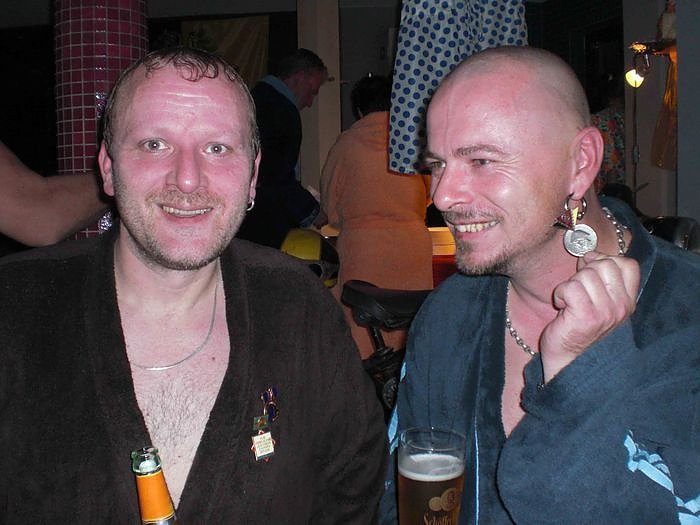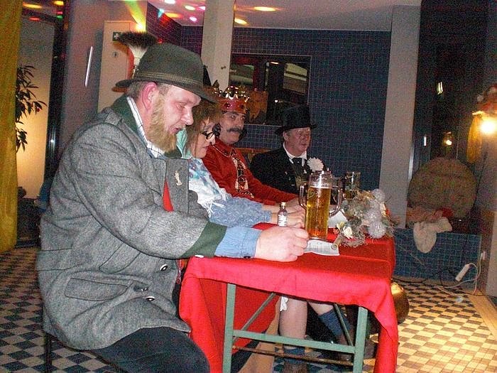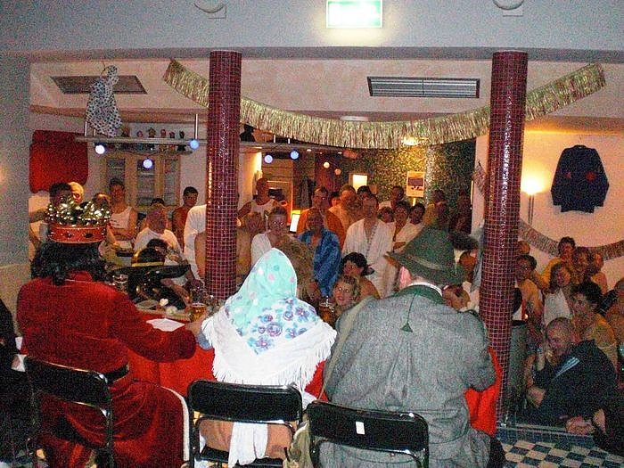 Der absolute Knaller des Abends war der vorangekündigte Überraschungsbesuch. Gegen 22 Uhr verschaffte sich die Rolandsgruppe Zugang zum textilfreien Bereich des Badehauses. Der Roland, die Hexe, Prof. Zwanziger und der Olle Ebersberg überzeugten sich, dass es bei den nackigen Nordhissern keusch und züchtig zugeht. Trotz erschwerter Arbeitsbedingungen, in voller Montur bei ca. 35°C, sorgten die Vier mit ihren lockeren Sprüchen für eine tolle Stimmung.