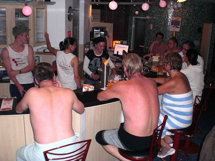 Im Rahmen der erfolgreichen Veranstaltung Mitternachtssauna hatte diesmal das Saunateam des Badehauses zu Broiler, Korn und Bollerwagen eingeladen. Der mit vielen Saunafreunden voll besetzte Saunabereich war mit Gegenständen des täglichen Lebens (Kittelschürzen, Waschpulver IMI und der beliebte Scheuersand ATA), mit Produkten, die vor mehr als 20 Jahren heiß begehrt waren (Motorrad Marke MZ RT bis hin zur Küchenmaschine Komet) und mit anderen Dokumenten der verblichenen DDR ausgestaltet.