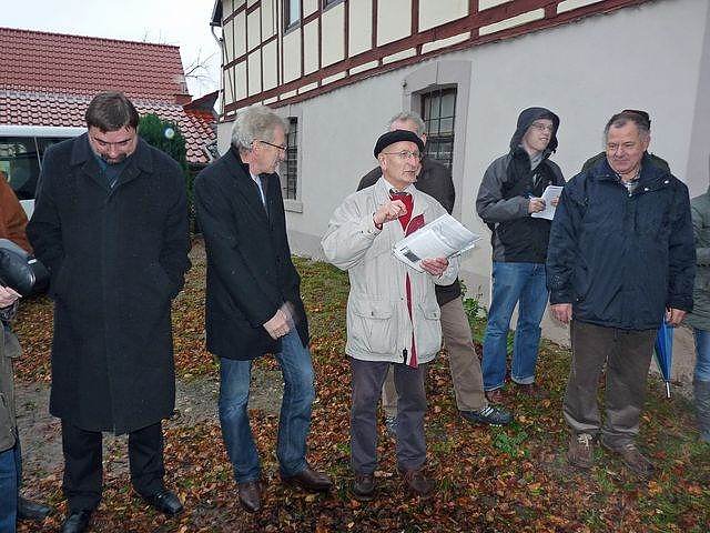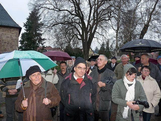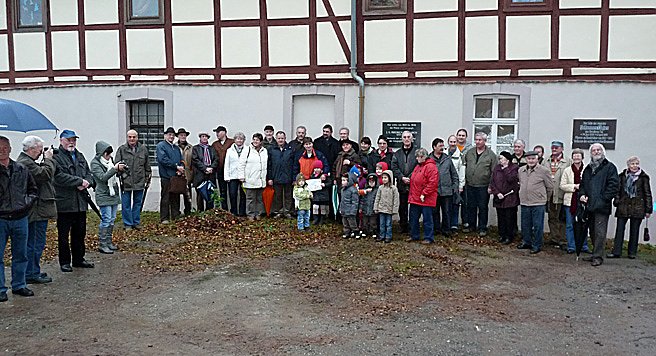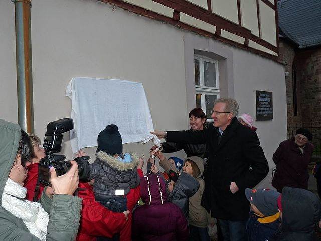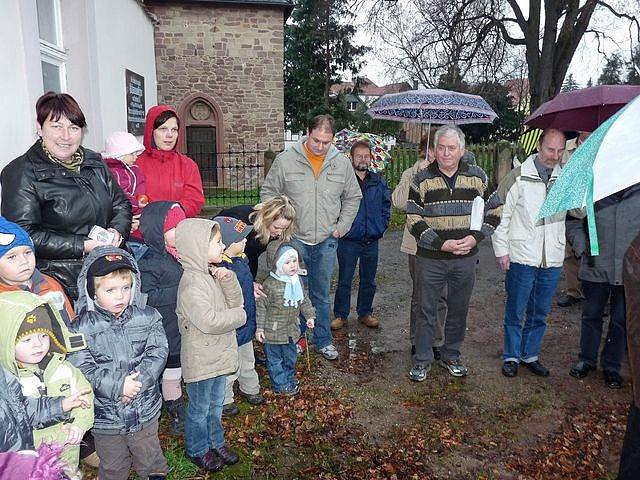 Trotz des nicht gerade schönen Wetters, waren zahlreiche Besucher an das Pfarrhaus nach Bendeleben. Helmut Köhler hatte die Aufgabe übernommen die vielen Gäste zu begrüßen, unter ihnen auch Ernst Spangenberg von der Firma Spangenberg Naturstein (aus Werningshausen (Landkreis Sömmerda) mit Zweigsitz in Sondershausen), von dessen Firma die Gedenktafel geschaffen wurde. Aber auch für die Kinder aus der Kita "Wipperfrösche" war die Enthüllung der Gedenktafel eine besondere Abwechslung.