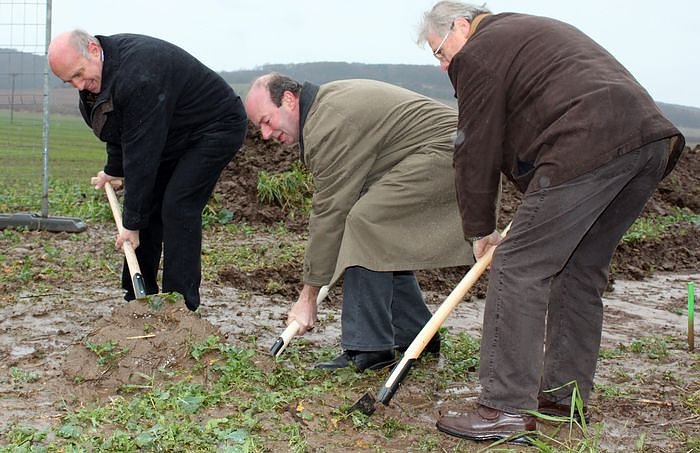 Mit einem Spatenstich im Regen hat heute der Bau des Geh- und Radweges zwischen Uthleben und Heringen offiziell begonnen. Landrat Joachim Claus und die Bürgermeister von Uthleben und Heringen, Fritz Lehmann und Fritz Helbing, stachen die Spaten in den matschigen Feldrand neben der Straße...