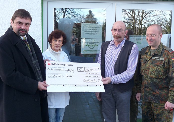 Bürgermeister Joachim Kreyer, Marion Schmidt von der Tafel Sondershausen, FAU-Leiter Lothar Hildesheim und Oberstleutnant Klaus-Günther Glaab bei der symbolischen Scheckübergabe vor der Tafel Sondershausen.