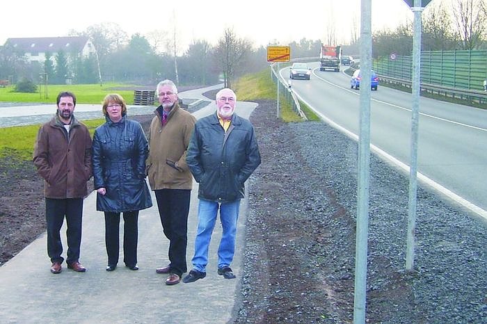 Aufstellung für den Fotografen: Winfried Ludolph, Inge Klaan, Franz Rohmund und Hein Peter auf dem Radweg Sundhausen