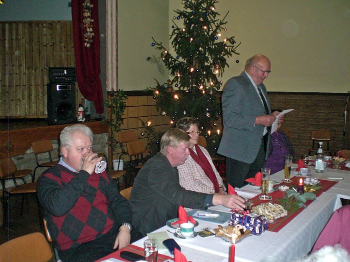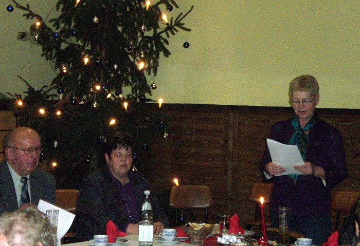 Die alljährliche Weihnachtsfeier im "Gasthaus zum Wolfstal" in Langenroda ist für den VdK-Ortsverband Donndorf-Wiehe-Bottendorf bereits eine gute Tradition, nicht nur, weil das Gasthaus für den Einzugsbereich der Mitglieder des Ortsverbandes günstig liegt, sondern auch weil das Umfeld stimmt. So strahlte am Nachmittag des 11. Dezember der Kanonenofen bereits eine wohlige Wärme aus, die Lichter am großen Weihnachtsbaum neben der Bühne leuchteten und die Tafeln waren weihnachtlich gedeckt. Man fühlte sich sofort wohl.