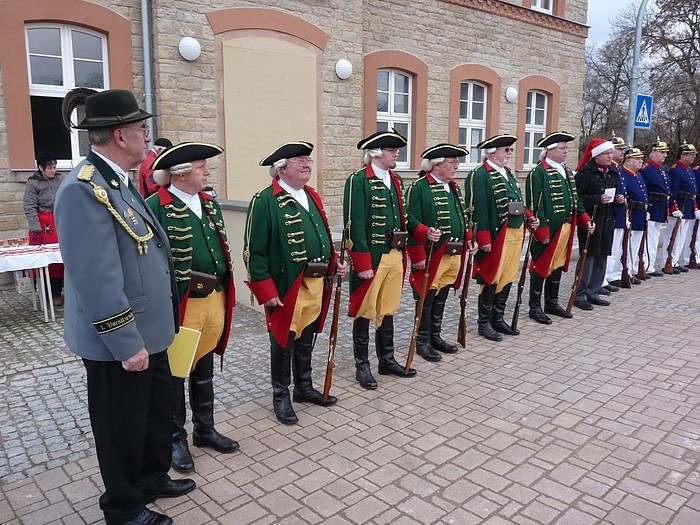 Zufuhr hatte Bürgermeister Rainer Heuchel (SPD) zahlreiche Gäste vor dem entstehenden ersten echten Rathauses begrüßen dürfen. Mit dabei der 1. Beigeordnete des Landrats Georg Schäfer (SPD) und Vertreter der Baufirma Schnellhardt aus dem benachbarten Donndorf, die ganz besonders an der Fertigstellung des 1. Bauabschnitts des neuen Rathauses beteiligt waren. Es ging bei Glühwein und einem Glas Sekt sehr friedlich zu, auch wenn sie der Bürgermeister lieber von militärischer Streitmacht schützen ließ, wie das Foto von kn beweist.