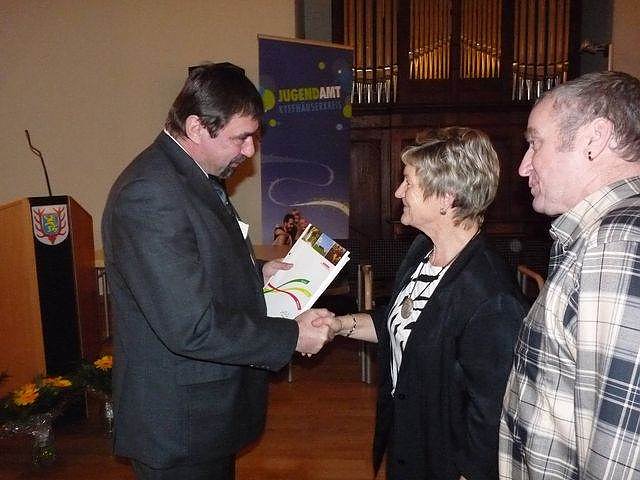Der 1. Beigeordnete des Landrates Georg Schäfer würdigte die Leistungen der Familie Palige aus Greußen, die bereits 54 Kinder in Pflege hatten. Hier stiftete die Kyffhäusersparkasse ein Aufmerksamkeit.