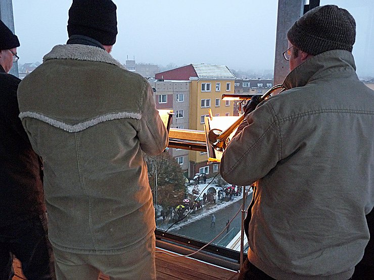Pünktlich ab 16:00 Uhr spielte der Posaunenchor Sondershausen weihnachtliche Weisen. Auftrittsort war nicht ein Konzertsaal, sondern der Turm der Cruciskirche am Wippertor von Sondershausen. Und statt zu sitzen gab es Stehplätze, was den Spaß aber nicht störte.