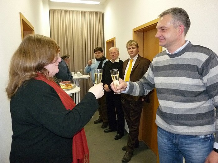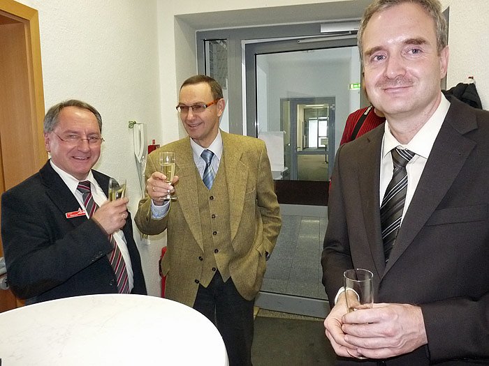 Auch Vertreter der Wirtschaft und der Finanzwelt waren gratulieren gekommen, so Ralph Haase, Geschäftsführer der Glückauf Sondershausen Entwicklungs- und Sicherungsgesellschaft mbH (GSES) und quasi "Hausherr" Ulrich Heilmann, Vorstandsmitglied der Kyffhäusersparkasse. Hausherr deshalb, befindet sich das Büro doch in einem Nebengebäu der Hauptstelle der Kyffhäusersparkasse in der Sondershäuser Ferdinand-Schlufter-Straße 23-25.