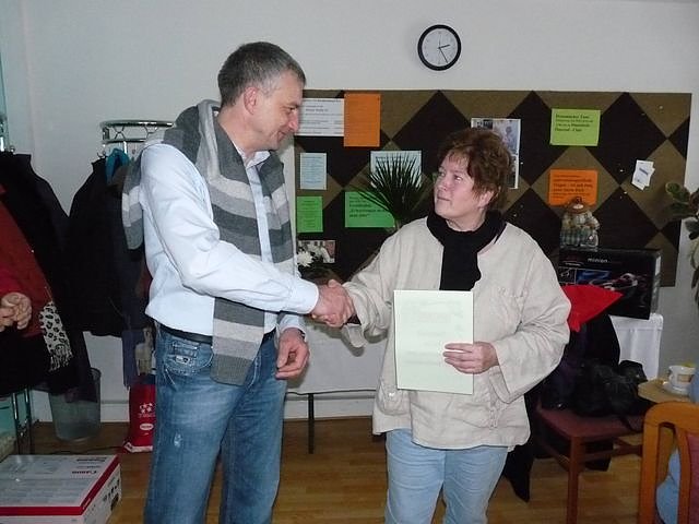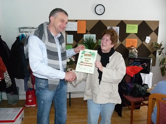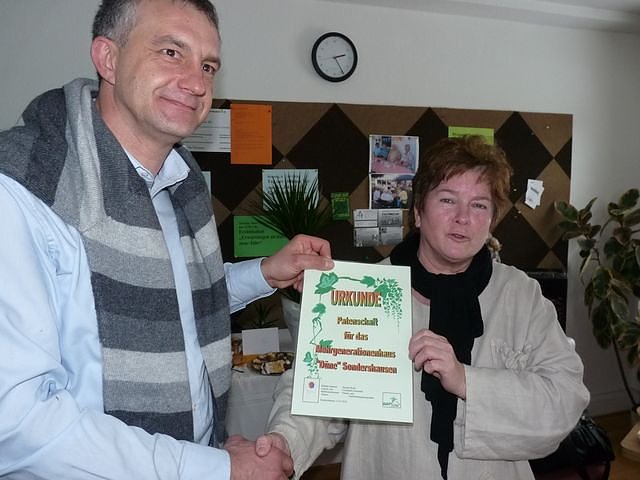 Am Nachmittag überzeugte sich der Bundestagsabgeordnete der SPD, Steffen Lemme von der Arbeit der Düne. Neben der Gratulation übernahm er auch die Patenschaft für das Mehrgenerationenhaus Düne eV. Als Dank übergab Vereinsvorsitzende Monika Schreier eine Ehrenurkunde, die Steffen Lemme in seinem neuen Bürgerbüro aufhängen will.