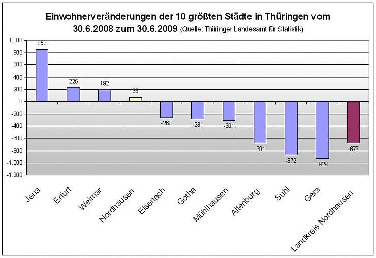 Neben Nordhausen hatten nur Jena (+853), Erfurt (+225) und Weimar (+192) einen Einwohnerzuwachs zu verzeichnen. Dagegen bilden Altenburg (-681), Suhl (-872) und Gera (-929) mit hohen Einwohnerverlusten die Schlusslichter. Suhl (39.848 Einwohner) ist somit auch unter die magische Grenze von 40.000 Einwohnern gefallen. Schlecht sieht es auch im Landkreis Nordhausen aus, denn trotz des Einwohnerzuwachses bei der Stadt hat der Landkreis insgesamt dennoch 677 Einwohner verloren.