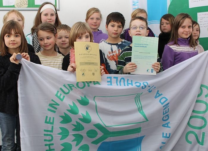 Susanne Mohr, Landeskoordinatorin für die Umweltschulen, und Angela Hoffmeister vom Schulamt in Worbis gratulierten den Grundschulen, die als einzige Schulen im Landkreis den Titel Umweltschule tragen. Mitgebracht haben sie nicht nur Fahne und Stempel mit dem Logo der Umweltschule, sondern auch eine nationale Urkunde, unterzeichnet von den Thüringer Ministern für Kultus und Landwirtschaft sowie der Deutschen Gesellschaft für Umwelterziehung, und einer internationale Urkunde – denn das Programm Eco-Schools gibt es weltweit. Über 20.000 Schulen in mehr als 40 Ländern beteiligen sich daran. In Thüringen sind im Schuljahr 2008/09 insgesamt 59 Schulen ausgezeichnet worden. In diesem Jahr feiert die Kampagne Umweltschulen in Thüringen selbst Jubiläum: sie wird 15 Jahre alt.