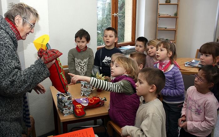 Ursula Böttcher, Mit-Initiatorin der Aktion Nikolaus übergibt die Geschenke an die Kinder der 1. Klasse des Förderzentrums Pestalozzi. Die Gelder gehen an den Förderverein des Zentrums zur Verwendung für warme Mittagessen
