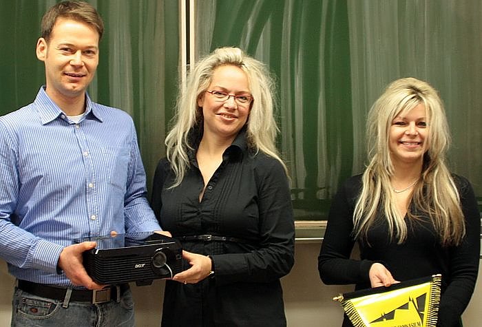 Andrea Kuprat (Mitte) von der Sparda-Bank übergibt Medientechnik im Wert von 1000 Euro an den Schulförderverein des Humboldt-Gymnasiums