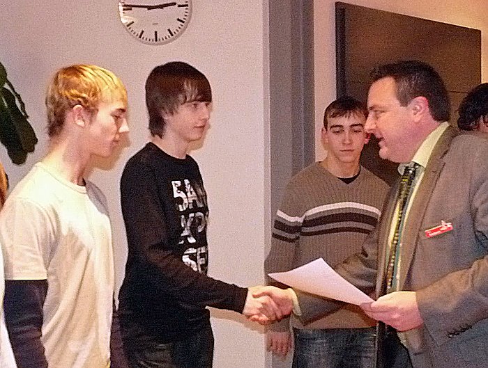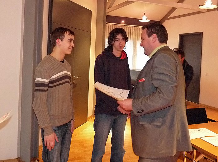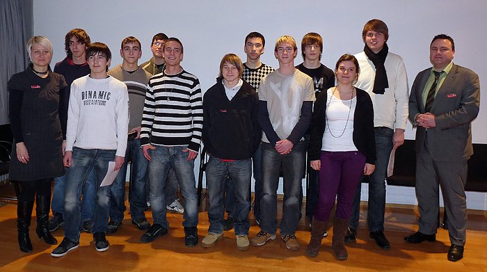 Hier präsentieren Dennis Becker und Christoph Stier, begleitet von Schulleiterin Sonja Helm, ihre Urkunden. Ingesamt gehörten sieben Mitglieder dem Team an.
