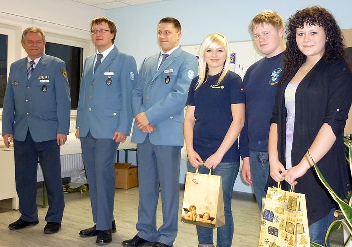 Ausgezeichnete Junghelfer, v.l.n.r.: N. Mönch (Geschäftsführer), J. Lehnert (Ortsbeauftragter), C. Holzheu (stellvertretender Ortsbeauftragter), J. Bernhagen, P. Wernicke, N. Kramer