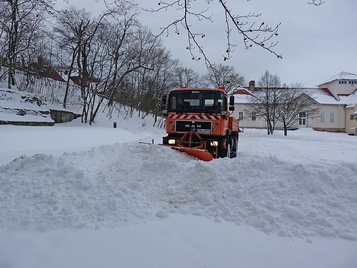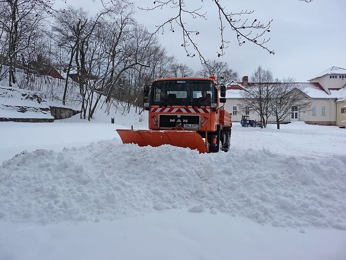 Das der Platz jetzt wieder als Parkplatz für das heutige Konzert genutzt werden kann, verdankt man dem neuen 3 m breiten Schiebeschild an dem Fahrzeug, womit man den Schneemassen schnell zu Leibe rückte.