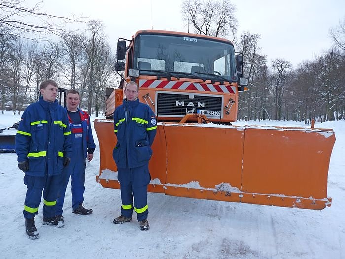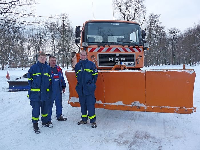 Natürlich nicht. Zum Glück gab es Hilfe in Form des Technischen Hilfswerkes (THW). Die rückten gleich mit zwei Fahrzeugen an und schoben den Schnee erst mal zur Seite. Gleichzeitig nutzen Christian Opis, Michael Hannig und Ronny Hagenbruch die Gelegenheit, die neu dazu gewonnene Technik vor kn zu präsentieren.