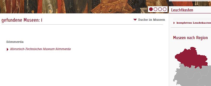 Es gibt auch eine schöne Suchfunktion, um über die Landkarte sich die Museen auszusuchen. Wobei schon überrascht, dass zum Norden dieses mal der Landkreis Sömmerda mit dazugehört, der sonst eigentlich mehr zu Mittelthüringen gezählt wird. Scheint aber mit Absicht so gewählt worden zu sein. Das nächste Bild verrät warum: