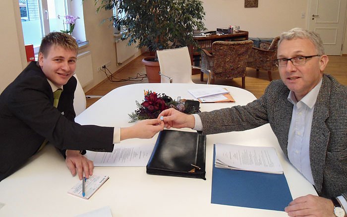 Im Anschluss an den Notartermin überreichte der Bürgermeister Matthias Strejc den Kaufpreis von 1,-€ an den Vizepräsidenten der Landeskirche Herrn Oberkirchenrat Stefan Große.