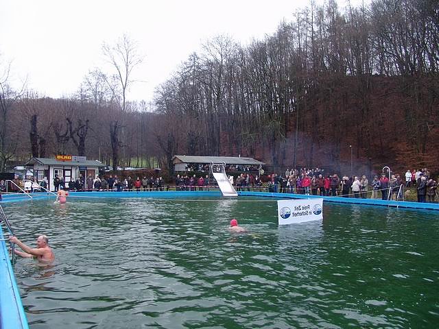 So geschehen am heutigen Neujahrtag: Zum bereits vierten Mal folgten Neujahrsbummler, Aktivisten und Schaulustige den Rufen nach wassersportlicher Herausforderung. Gelanden hatten Förderverein "Waldbad Neustadt" und DLRG Ortsgruppe "Hohnstein" zum traditionellen Anbaden in das schöne Freibad des Südharzstädtchens. Trotz miserabelster Wetteraussichten durften die Organisatoren fast 250 Gäste aus nah und fern begrüßen, um das Neue Jahr zünftig "anzuwässern".Es fanden sich immerhin 13 Damen und Herren, die das 4 Grad warme Wasser tüchtig aufwirbelten und sichtlichen Spaß daran hatten. Keiner hat es bereut, hatten doch einige ihrer Anbadepremiere sehr skeptisch entgegen gesehen. Unter dem Jubel der Umstehenden wurde mal wieder ein Zeichen gesetzt und das Neustädter Waldbad in den Mittelpunkt des öffentlichen und sportlichen Interesses gerückt.