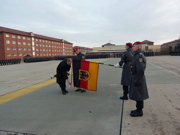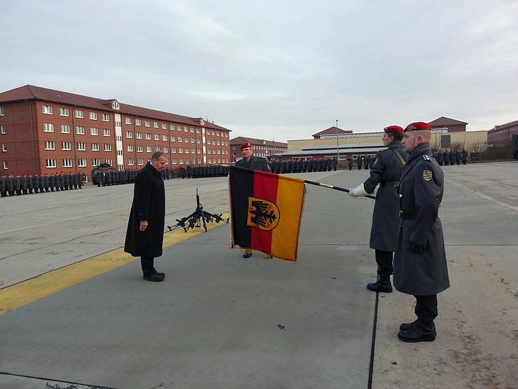 Die Verbundenheit der Soldaten mit den Bürger, sowohl hier in der Region, und auch im Freistaat, sei die Veranlassung gewesen, für die feierliche Verleihung des Fahnenbands durch den Freistaat Thüringens für das Logistikbataillons 131 Bad Frankenhausen. Zusammen mit Oberstleutnant Steinseifer wurden das Fahnenband an der Truppenfahne befestigt.