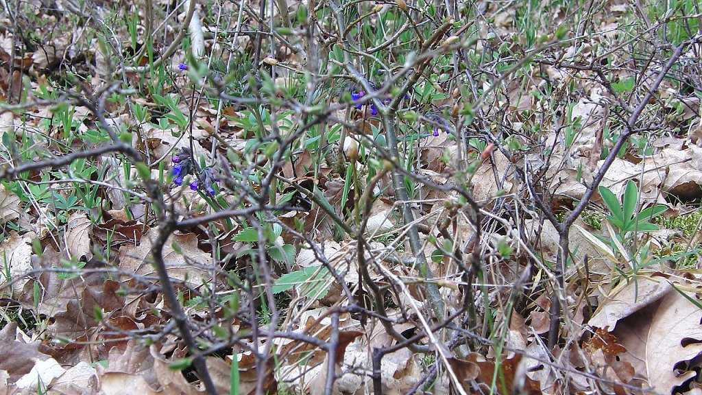 Die Bilder zeigen das leuchtend blau blühende Schmalblättrige Lungenkraut im Frühjahr 2012 an seinem verbuschenden Standort sowie den gestrigen Zustand des Standortes vor und nach dem Pflegeeinsatz. Das gerodete Strauchgut wurde randlich abgelagert.