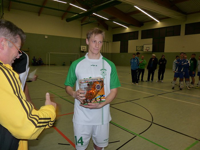 Immerhin konnten die Zuschauer 56 Tore bewundern, die an diesem Abend geschossen wurden. Übrigens mit "fatalen" Folgen für mache Torschützen. Jeder der ein zehntes Tor schoss, musste seiner Mannschaft "einen Meter" Bier spendieren. Leider hatte kn vergessen zu zählen, wie viele Becher Bier der Meter hatte. Der beste Torschütze vom letzten Jahr, Sebastian Caspar, spielte nicht mit so dieses Jahr der Weg frei war für Lukas Erdmann von der Eintracht aus Sondershausen mit sechs Treffern.