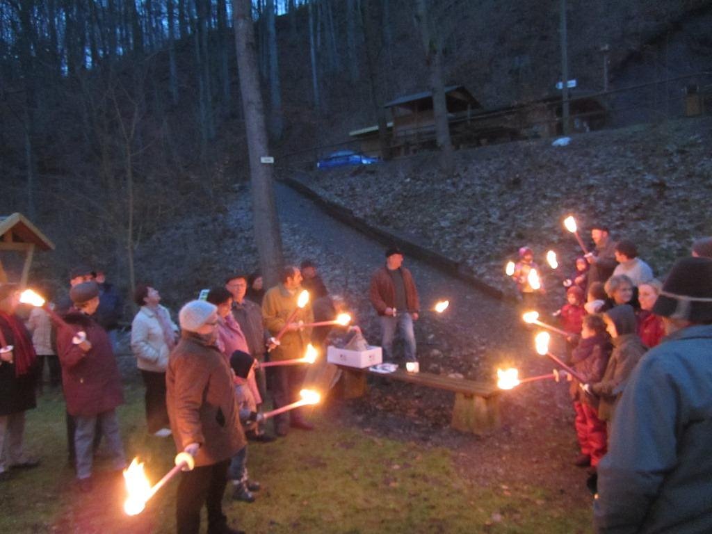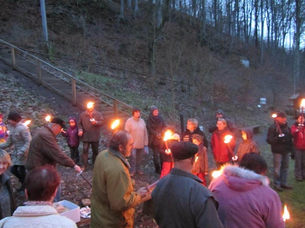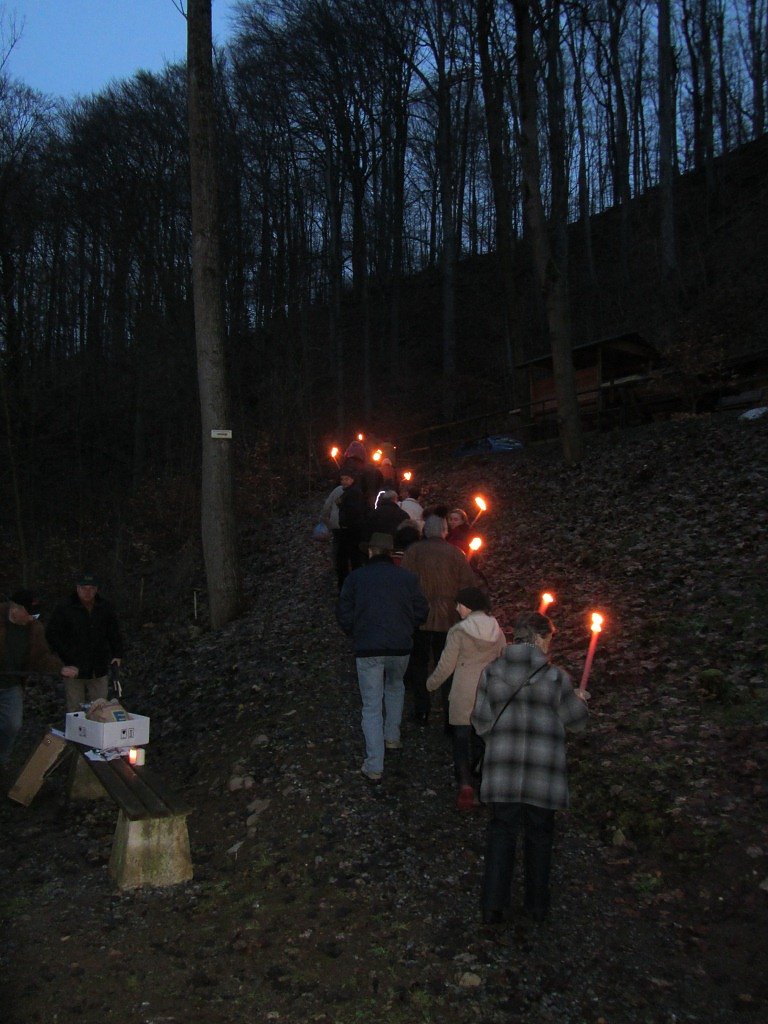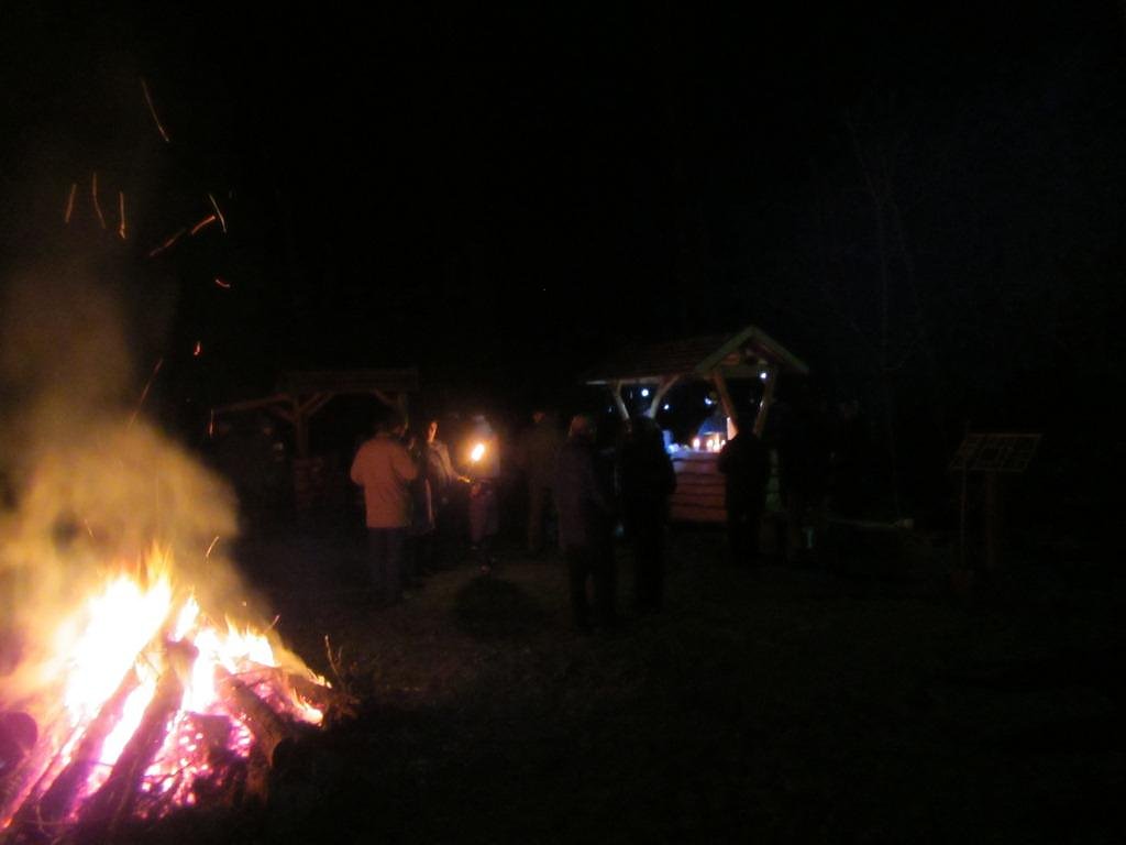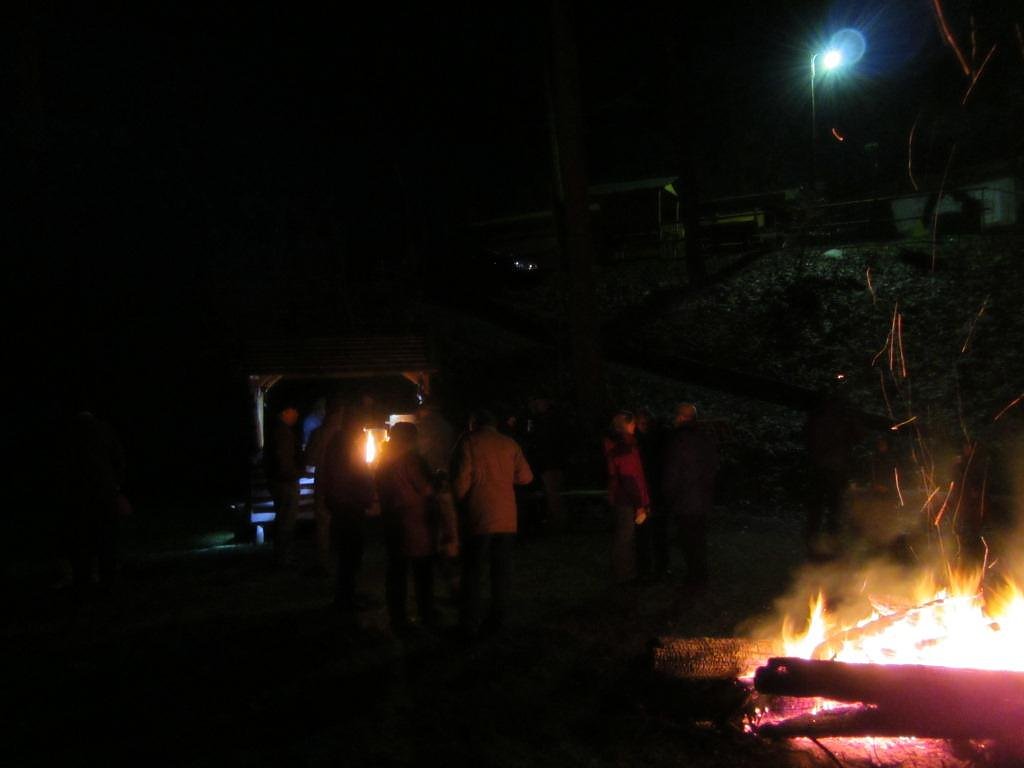 Schon bei der Ankunft der Gäste brannte das winterliche Feuer um Wärme zu verbreiten. Nach einigen noch notwendigen Vorbereitungen war es dann so weit und die Fackeln wurden angezündet. Dann ging es im Schein der Fackeln den schmalen Pfad hinauf auf den Bergrücken. Langsam wand sich der Lindwurm mit den Fackeln den Berg hinauf.
