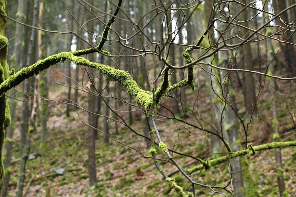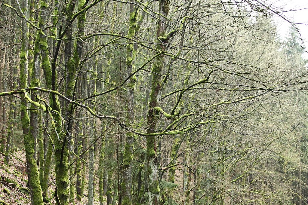 Viele Bäume, vor allem die Stämme, waren mit einer intensiven Moosbewachsung überzogen. So zeigte sich auch der Laubwald in einem ungewöhnlichen Grün.