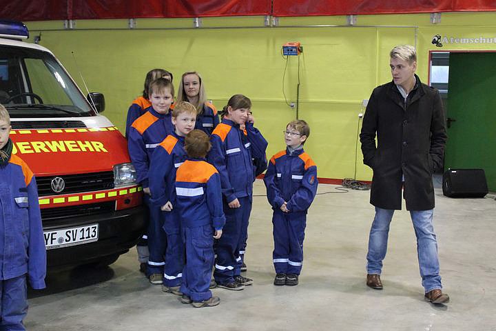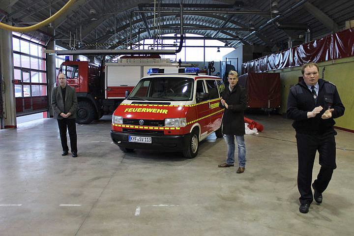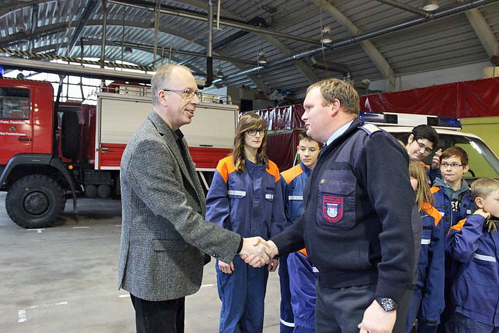 Mit einem herzlichen Händedruck bedankte sich der Leiter der Jugendfeuerwehr Jens Fischer für das neue Fahrzeug.