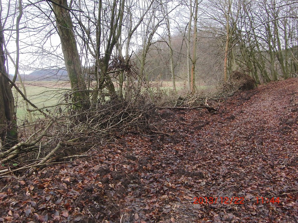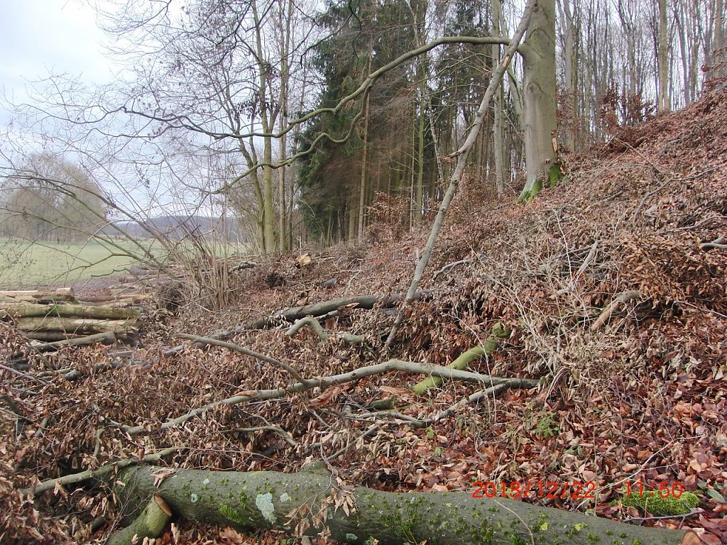 Wer den Karstwanderweg hier gegenwärtig nutzen will, der kann dies nicht tun, weil er faktisch nicht mehr existiert bzw. nicht mehr sichtbar ist: Missbraucht als Holzlagerplatz und Bulldozerfahrstrecke. Ausweichmöglichkeiten gibt es nur auf die an das Waldgebiet nördlich angrenzende Wiesen der Wiedaaue, die randlich jedoch ebenfalls von Forstfahrzeugen aufgewühlt wurde. Die Färbung des lagernden Holzes beweist, dass der Forst hier schon vor mehreren Wochen tätig war.
