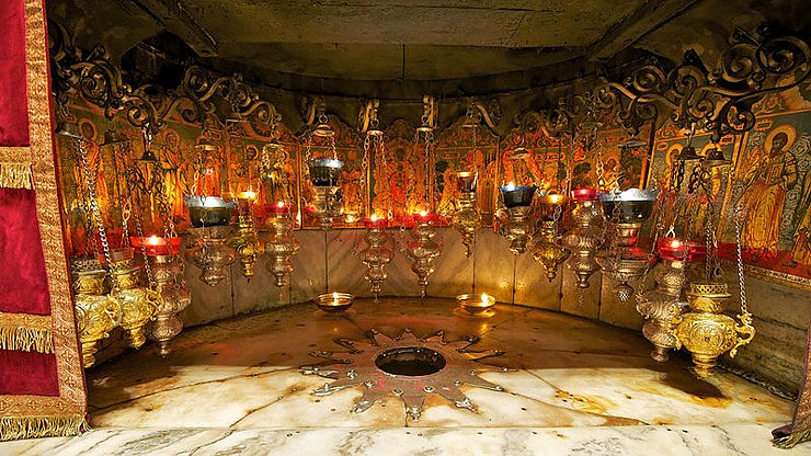 In den weiteren Bildern sehen Sie den Eingang zur Geburtskirche, die Geburtsstelle von Jesus, die Sterbekirche, einen Blick auf Jerusalem, die Todesangstbasilika auch Kirche der Nationen genannt, den Garten Getsmani und die Klagemauer.