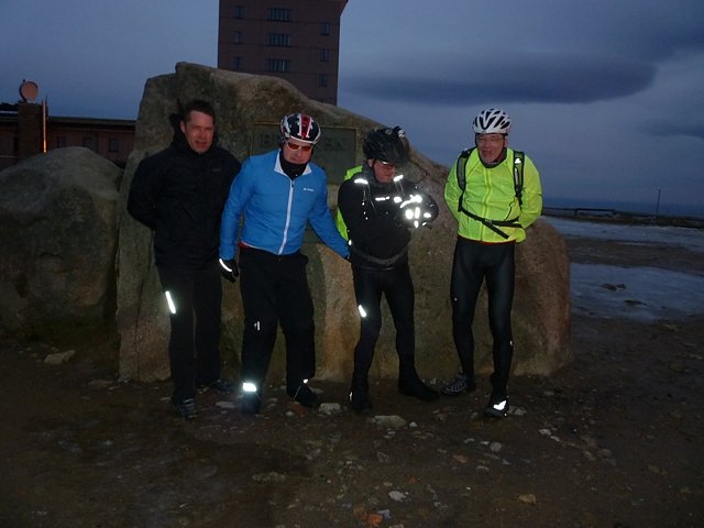 In diesem Jahr war es eine wunderbarer Sonnenaufgang, der die Radfahrer auf dem Gipfel belohnte. Zuvor war es jedoch notwendig, gegen die teilweise heftigen Sturmböen anzukämpfen, um das Gipfelplateau zu erreichen. Teilweise war Teamarbeit gefragt, Mensch und Material zu stabilisieren. In tiefrotem Farbspiel erschien der Stern am Horizont und tauchte alles in ein warmes Licht, das sich trotz kaltem Sturmwind angenehm anfühlte.