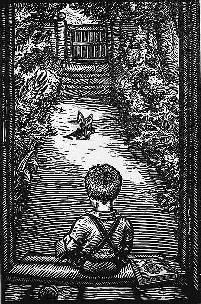 Auf der Schwelle zwischen Vergangenheit und Zukunft blickt das Kind zwar nach vorne, aber es wird mit seiner Vergangenheit konfrontiert. Die Situation des Kindes ist die des Erwachsenen, der innehält und am Ende eines Kalenderjahres fragt, was Gott für ihn im neuen Jahr bereithält und vor die Füße legen wird. Auf der Schwelle muss ich mich entscheiden, ob ich ausharren oder weitergehen will. Ob ich bereit bin, den Gartenweg zu betreten oder auf der Schwelle des Hauses sitzen bleiben möchte. Der Blick nach vorne bewahrt die vergangenen Bilder in sich auf. Diese müssen sich nicht als Störung erweisen, als Hindernis, den Gartenweg zu betreten. Die Schwelle stellt in diesem Holzschnitt zwar eine Grenze dar, aber auf Zukunft hin.