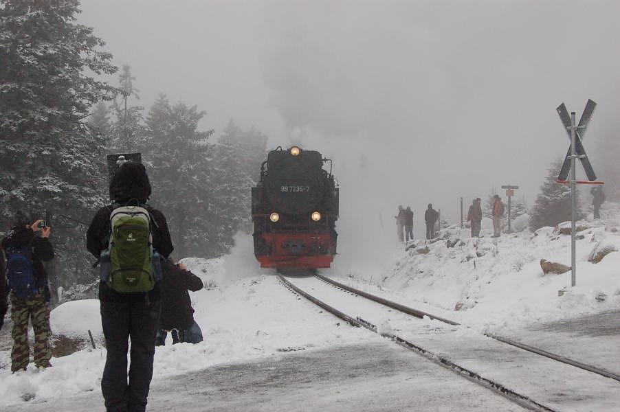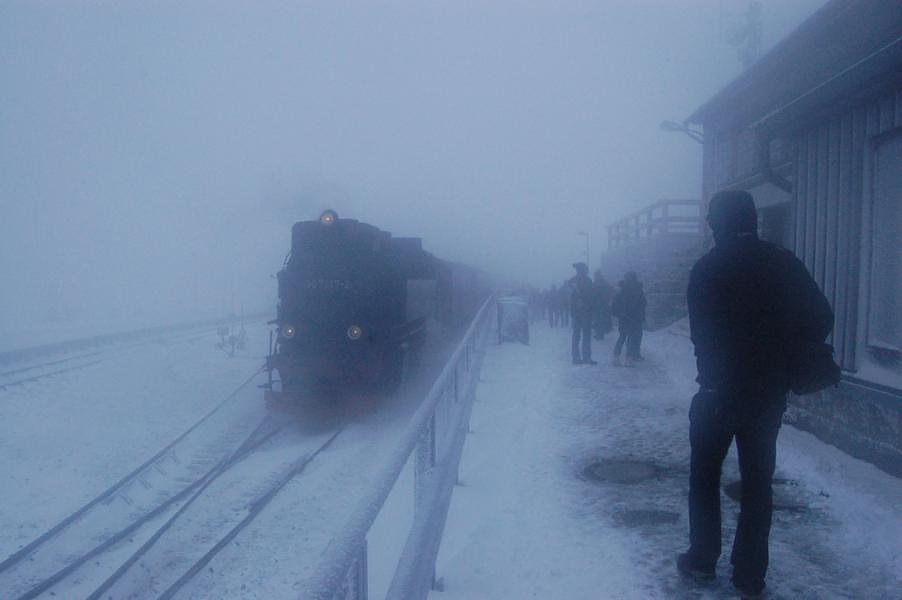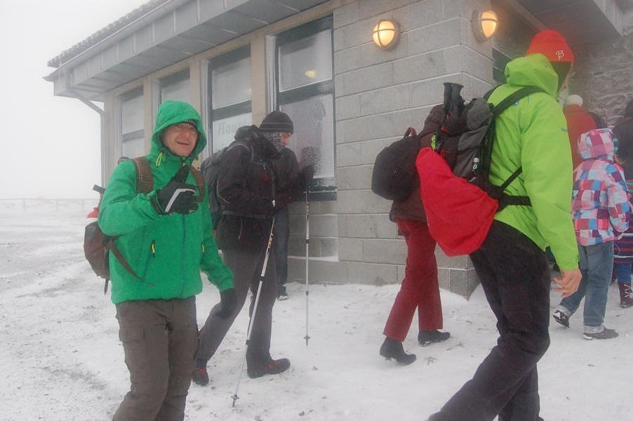 Oben angekommen bei nicht sehr schönem Wetter, aber egal, fuhr auch schon die Harzquerbahn ein und aus ihr stiegen noch ein paar Doppelkörner aus. Zusammen ging es dann zum Brockenwirt, Erbsensuppe mit Bockwurst essen und ein Bierchen dazu und dann war es Zeit für den gemeinsamen Abstieg.