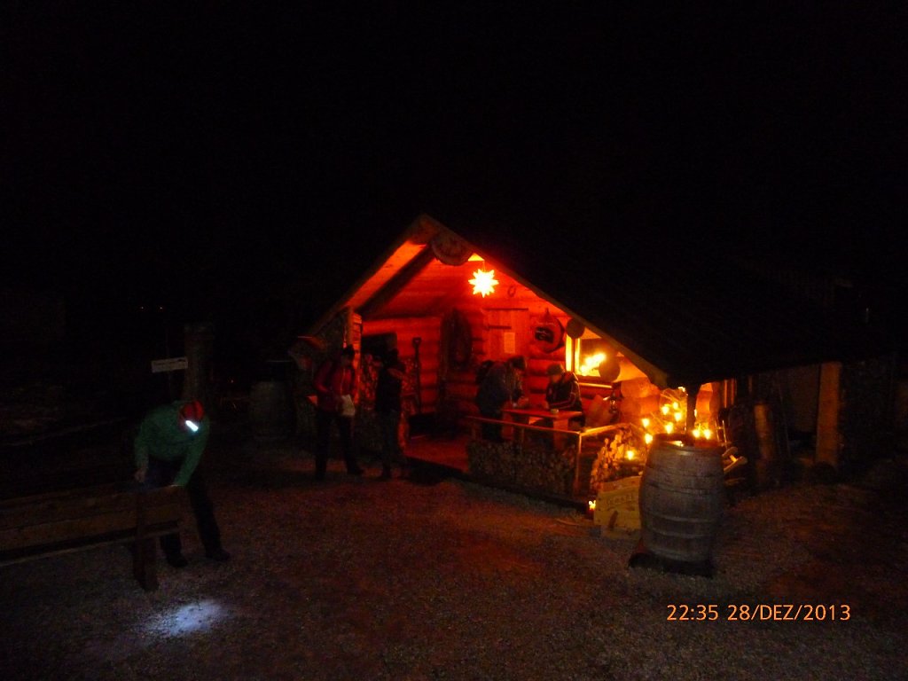 In manchen Jahren mussten sich die Wanderer sogar beim Spuren durch 20 oder 30 cm tiefem Schnee abwechseln. Davon konnte diesmal jedoch keine Rede sein: Grün-braune Wege, Weihnachtsbäume mit Elektrokerzen aber ohne Schneekristalle und alte Bergbauernhäuser ohne Eiszapfen. Nur im Gebiet des knapp 900 Meter hohen Aschbergs, sonst ein Wintersportzentrum, sahen wir wenigstens ein paar Schneeflecken.