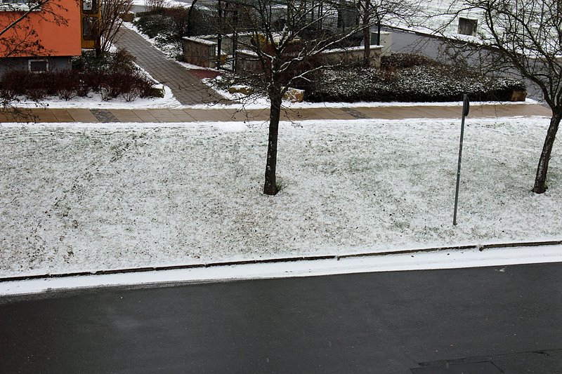 Kaum freuen werden sich die Kinder, denn selbst zum Rodeln ist das bisschen Schnee kaum geeignet. Und Nachschub scheint nicht mehr zu kommen, denn es fällt kein Schnee mehr. Da das Digitalthermometer bereits 0,0 °C anzeigt, könnte auch das bisschen Weiß bald verschwunden sein.